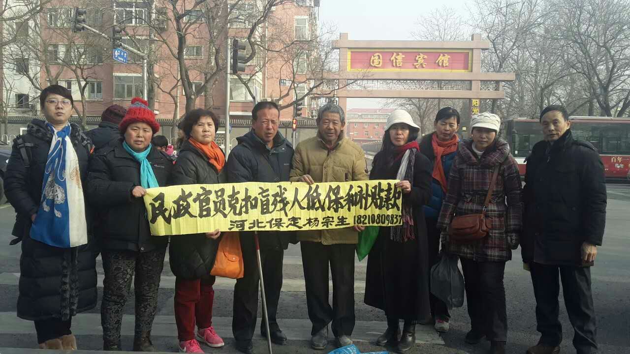 相关报道:在京访民张打横幅 谴责保定政府官员侵吞双目失眼访民杨宗生低保金和残疾补贴款