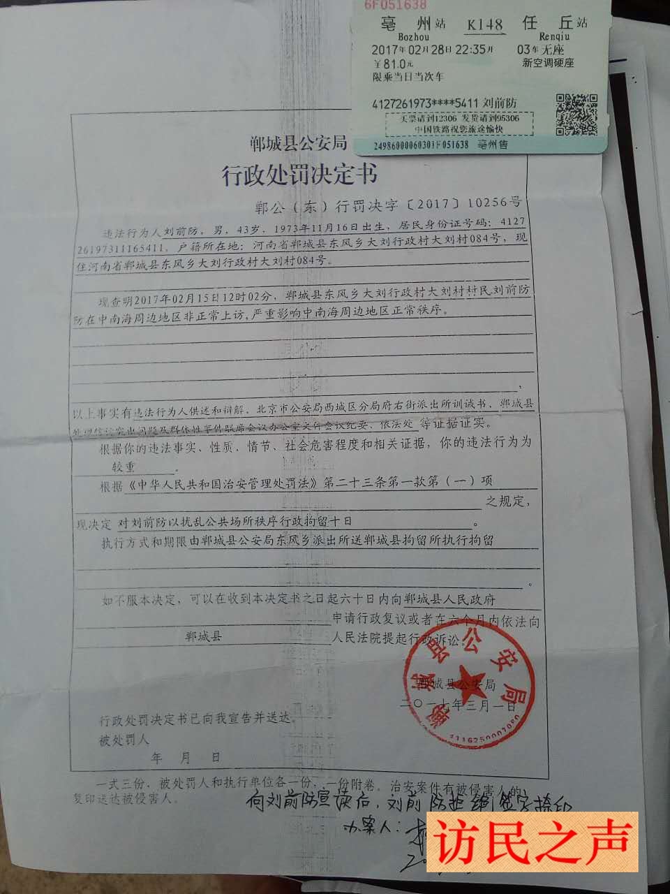刘前防表示,郸城县警方依据的是北京警方出具的训诫书。但北京警方并没有把训诫书给他本人,却给了郸城县公安局。有训诫书就证明是处罚过了,郸城县公安局在给予二次处罚就是违法。